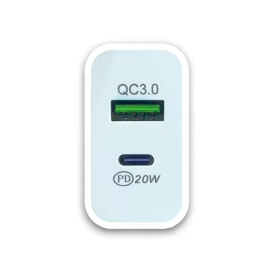 Dual Port USB-C/USB-A Charger, 20W, QC3.0 Fast Charging Block
